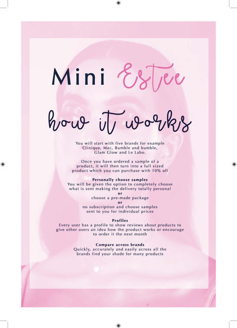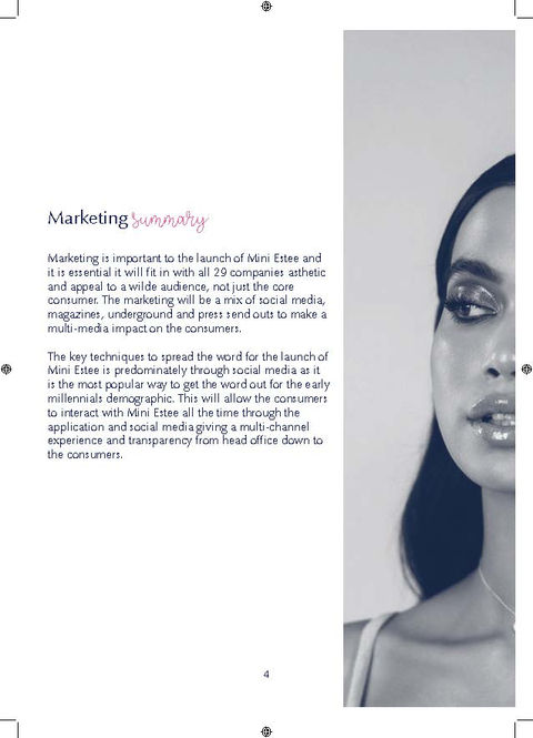and appeal to a wilde audience, not just the core consumer. The marketing will be a mix of social media, magazines, underground and press send outs to make a multi-media impact on the consumers. The key techniques to spread the word for the launch of Mini Estee is predominately through social media as it is the most popular way to get the word out for the early millennials demographic. This will allow the consumers to interact with Mini Estee all the time through the application and social media giving a multi-channel experience and transparency from head office down to the consumers.