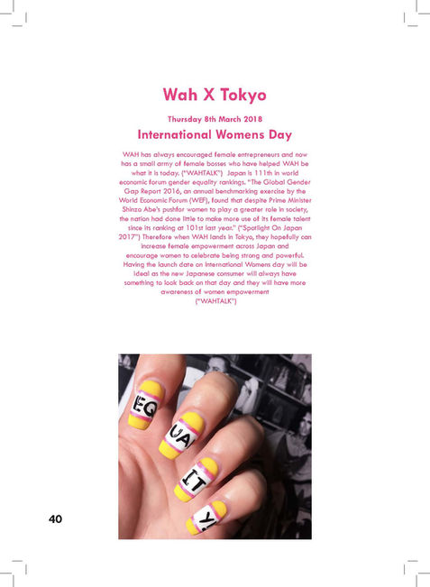 The nail industry is currently worth £153million, with the average British woman spending on around £450 on their nails a year. WAH are now the leading salon in London for nail art and changing the way people go to salons. With the help of owner Sharmadean, her millenial voice and innovative ideas, nail salons will never be the same again. Since opening her store in Soho, London, customers can now have futuristic virtual reality experience. To make WAH stronger and kick start world domination, the next step is to launch WAH Tokyo, with Japan being the worlds largest share in the world for electronics and technology, WAH is garunteed to keep stepping up the game of salon technology when they internationalise to Japan with it being so advanced.